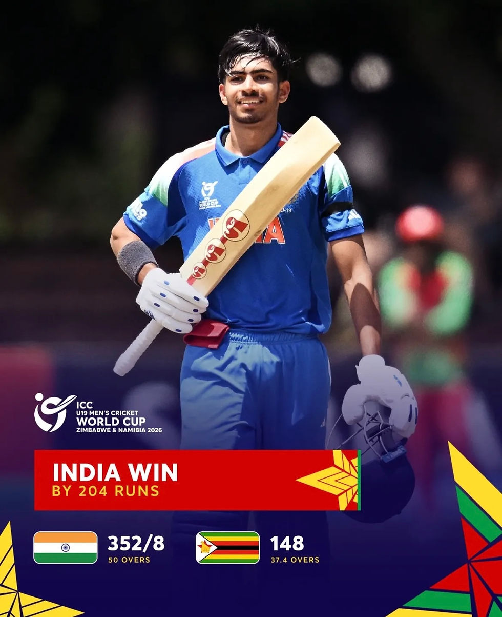 Zimbabwe’s chase never gained traction as they lost early wickets, including Nathaniel Hlabangana, Dhruv Patel and Brendon Senzere. Although Leeroy Chiwaula showed resistance with a fighting half-century, regular strikes from Ayush Mhatre and Udhav Mohan, who claimed three wickets each, triggered a lower-order collapse and saw Zimbabwe bowled out for 148.